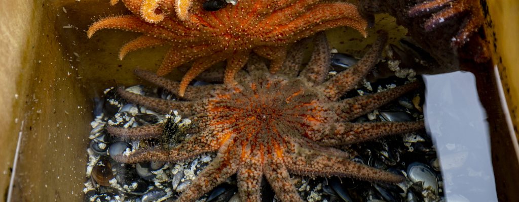 Adult sunflower sea stars feeding on mussels at UW Friday Harbor Laboratories. The stars suck out and ingest the soft tissues of mussels, then discard the shells, which collect at the bottom of the tank. The sea star on the bottom, “Charlotte,” is the mother of the lab’s stars grown in captivity. “It was like…