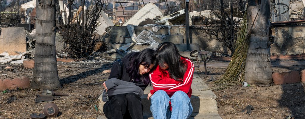 Sisters Emilee and Natalee De Santiago sit together on the front porch of what remains of their home on January 19, 2025, in Altadena, California. In the wake of the record-breaking wildfires in Los Angeles in January — some of the most expensive and destructive blazes in history — one of the first things California…